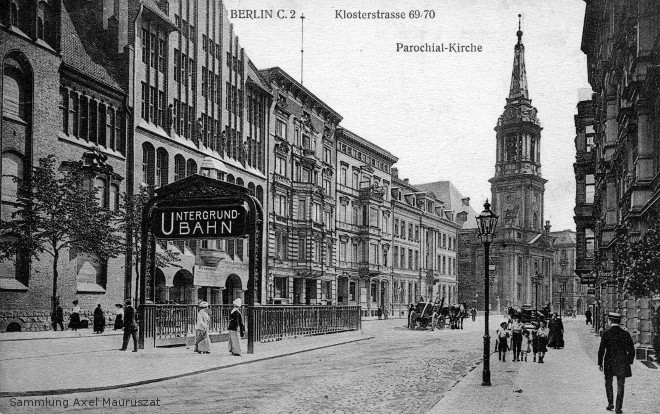 Nördlicher Eingang zum U-Bahnhof in der Klosterstraße (um 1915). Im Hintergrund die Parochialkirche.
