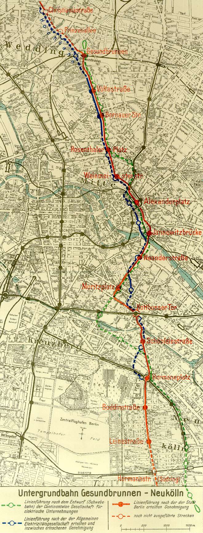 Der Gedanke einer elektrischen Schnellbahn vom Gesundbrunnen über den Alexanderplatz nach Neukölln ist über 25 Jahre alt. Die Continentale Gesellschaft für elektrische Unternehmenungen trat im Jahre 1902 an die städtischen und Staatsbehörden mit dem Plan heran, zwischen diesen Stadtteilen eine Schwebebahn, ähnlich der in Elberfeld-Barmen, zu bauen (s. Anlage I). Eine für Berlin bestimmte Probeausführung der Viaduktkonstruktion in der Brunnenstraße vermochte die städtebaulichen Bedenken der städtischen Behörden nicht zu zerstreuen; der Plan scheiterte. Hingegen hatte der Plan Erfolg, mit dem die Allgemeine Elektricitäts-Gesellschaft, noch während die Verhandlungen mit der Continentalen Gesellschaft für elektrische Unternehmungen in der Schwebe waren, hervortrat, in diesem wichtigen Verkehrszuge eine Untergrundbahn zu bauen. Diese Gesellschaft erhielt 1912 zu ihrem Entwurf die Zustimmung der Stadt Berlin und im Jahre 1913 die landespolizeiliche Konzession.