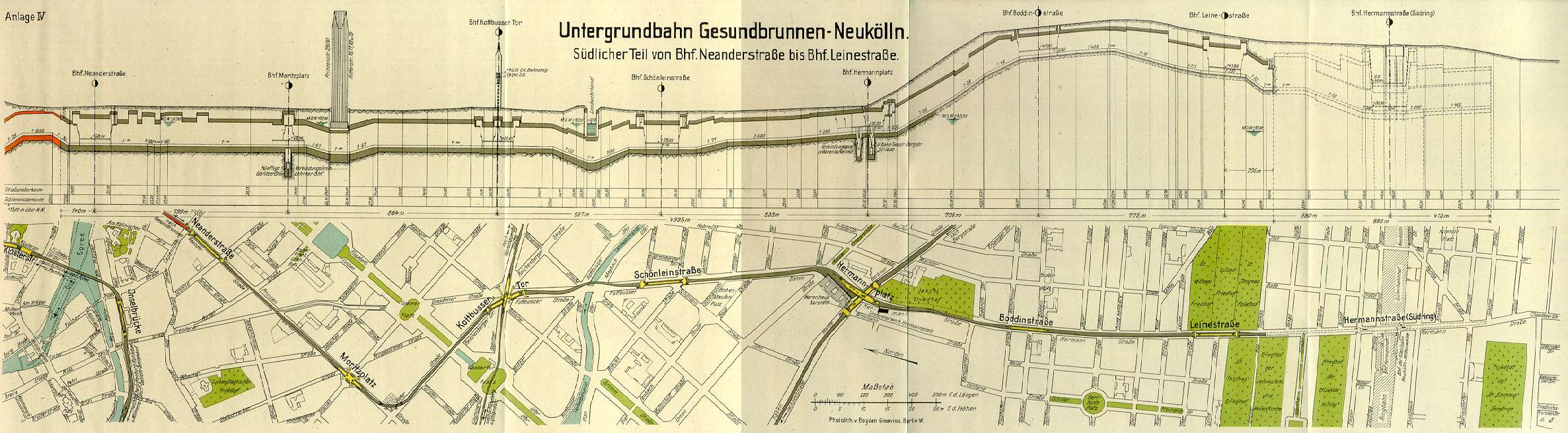 Wenn am südlichen Ende der Bahn das bereits begonnene Tunnelstück zwischen Leinestraße und dem Südring fertiggestellt sein wird, wird die neue Bahn neben der Untergrundbahn von der Seestraße nach Tempelhof und Neukölln eine weitere Schnellbahnverbindung in nordsüdlicher Richtung zwischen Nordring und Südring der Reichsbahn bilden. Die alte Nordsüdbahn verbindet den Nordringbahnhof Wedding mit dem Südringbahnhof Tempelhof; die neue Untergrundbahn verbindet den Nordringbahnhof Gesundbrunnen mit dem Südringbahnhof Hermannstraße und verfogt nachstehende Straßen und Plätze: