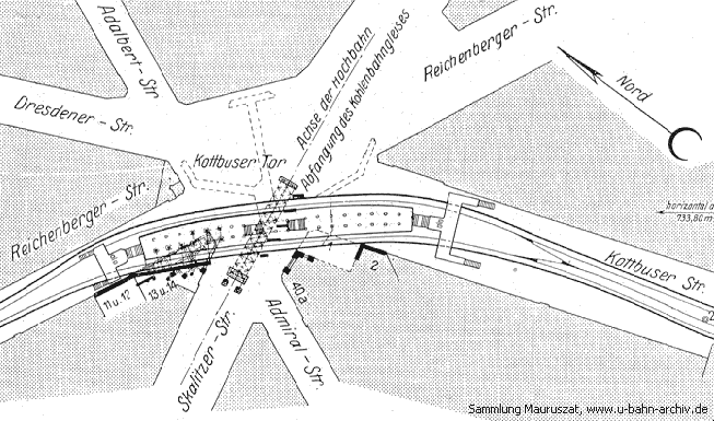 Lageplan des Untergrundbahnhofs Kottbusser Tor in seiner ursprünglichen Form mit Zwischengeschossen und Zugängen