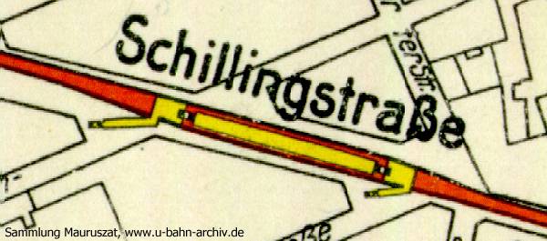 Der U-Bahnhof Schillingstraße verfügte als Durchgangsbahnhof unter der Frankfurter Allee über jeweils ein Zwischengeschoß an den Bahnsteigenden. Von diesen führte jedoch nur jeweils ein im 45°-Winkel abgeknickter Ausgang zur südlichen Straßenseite.