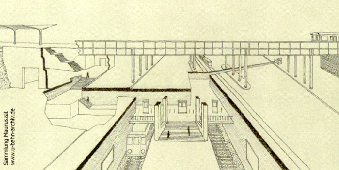 Schnitt durch den U-Bahnhof Tempelhof mit dem Ausgang zur Ostseite des Tempelhofer Damms (rechts)