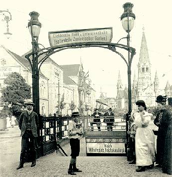 Der U-Bahnhof Zoologischer Garten wurde 1902 als unscheinbarer Durchgangsbahnhof mit zwei Außenbahnsteigen angelegt. Von diesen führte an den westlichen Enden jeweils ein Ausgang an die Oberfläche, die dort mit Jugendstilportalen nach Entwürfen von Alfred Grenander geschmückt waren.